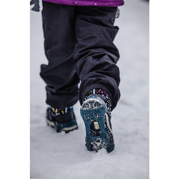Broddene er utstyrt med stålspiraler i front som gir solid grep når barnet går eller løper fremover. På hælen sitter to pigger som gir ekstra stabilitet i nedoverbakker og på isete underlag. Resultatet? Bedre balanse, mindre risiko for fall, og mer trygg vinterlek.