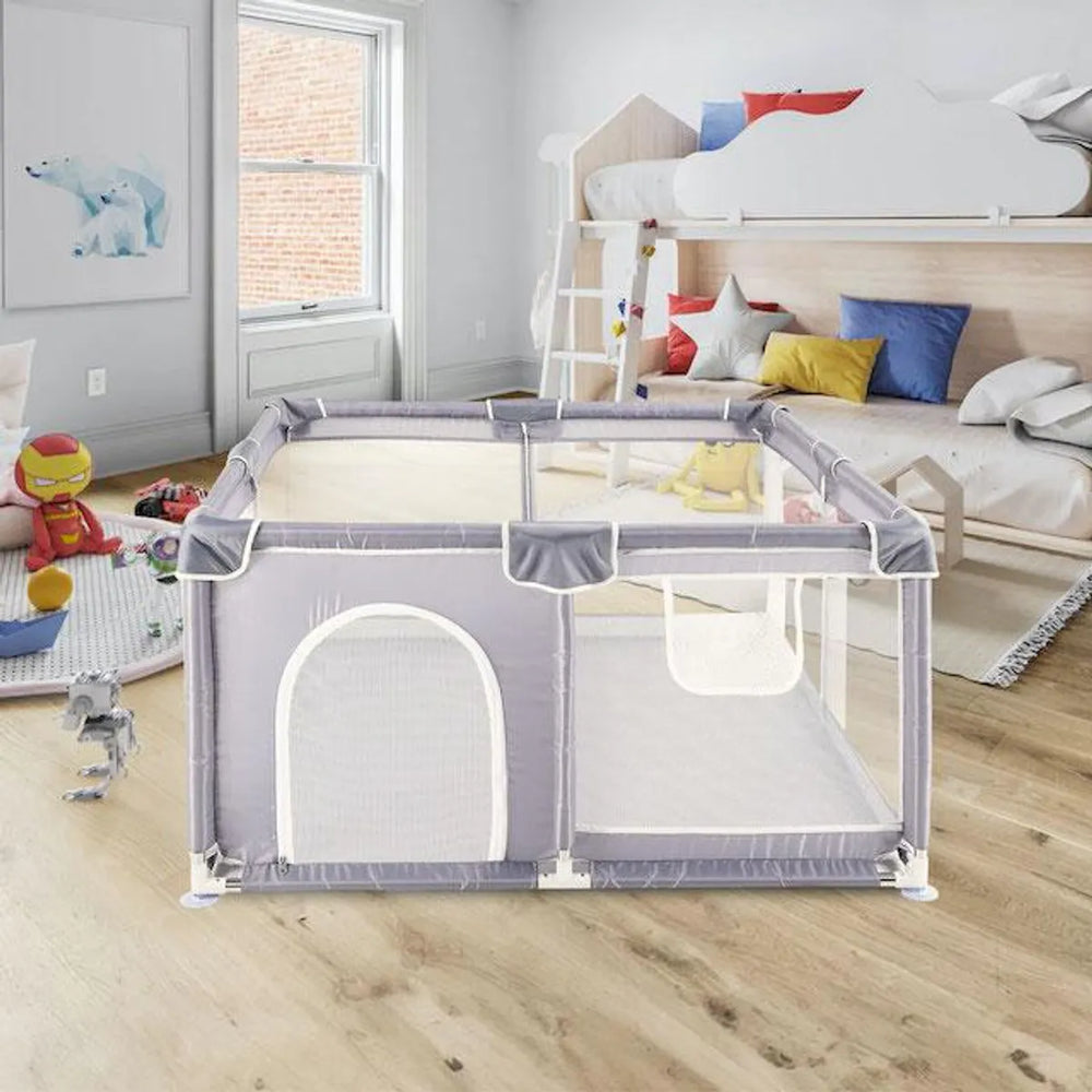 Den står stødig på gulvet med sugekopper, enten du setter den på parkett eller fliser. En av sidene kan åpnes med glidelås slik at barnet selv kan krabbe inn og ut når det er tid for det. Perfekt for å gi barnet mestringsfølelse samtidig som du beholder kontrollen.
