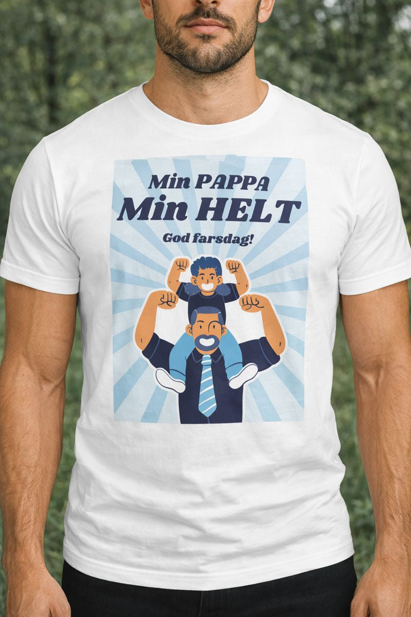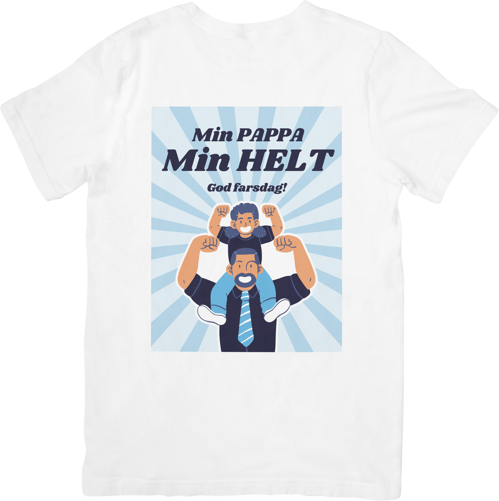 Denne t-skjorten er laget for pappaen som alltid stiller opp. Han som bærer, støtter, løfter og ler. Motivet viser en pappa med barnet på skuldrene, begge med armene i været, et bilde på styrke, trygghet og ekte hverdagshelter. Teksten sier det rett ut: Min pappa, min helt.