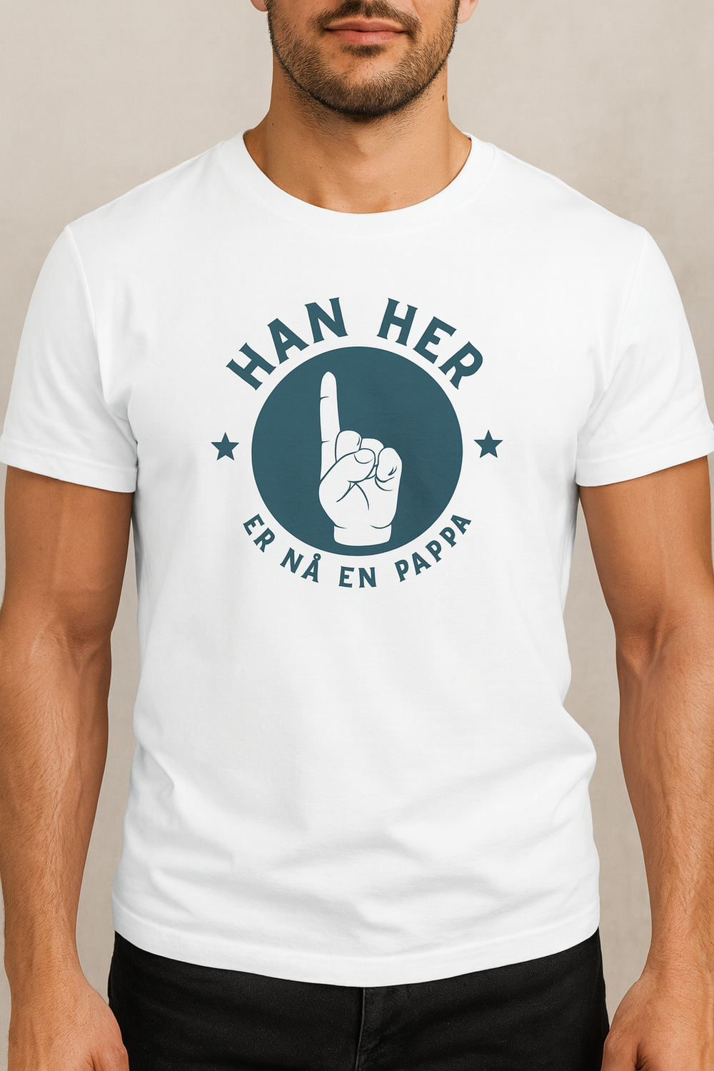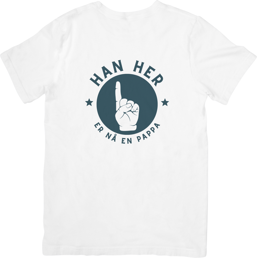 Denne t-skjorten er laget for nybakte pappaer som vil vise verden den store oppgraderingen i livet sitt. Med teksten “Han her er nå en pappa” og et tydelig håndmotiv som peker oppover, er dette en morsom og stolt statement-shirt som passer perfekt både hjemme, i pappagruppa og på trilletur.